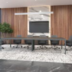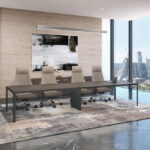 Mesa de Juntas Studio compuesta por cubierta con medidas de 3.60 X 1.20. Disponible en melamina y chapa de madera.